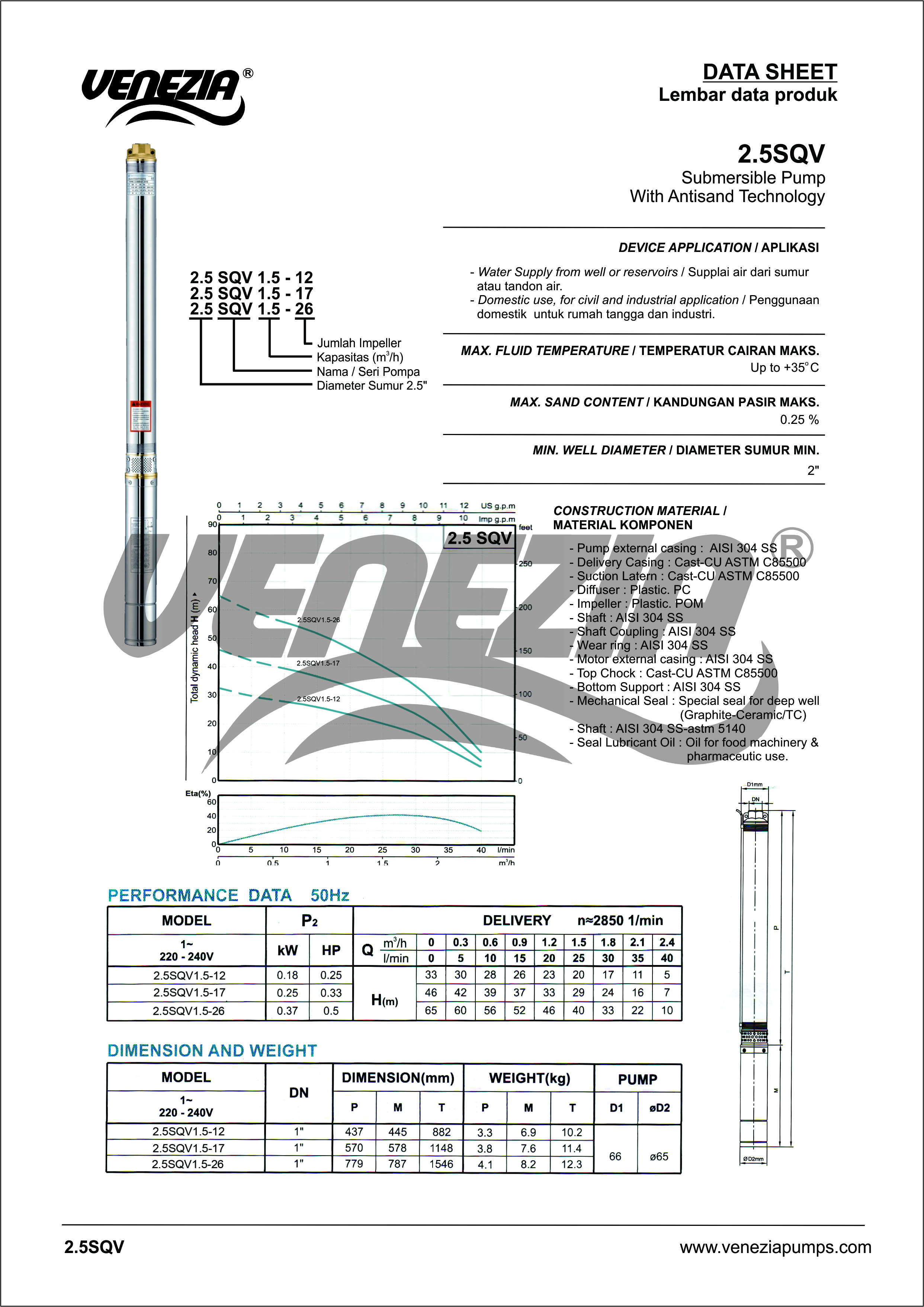 Pompa Submermersible 2SQV & 2.5SQV adalah Pompa untuk Sumur dalam yang memiliki Casing 2″ dan 2,5″.