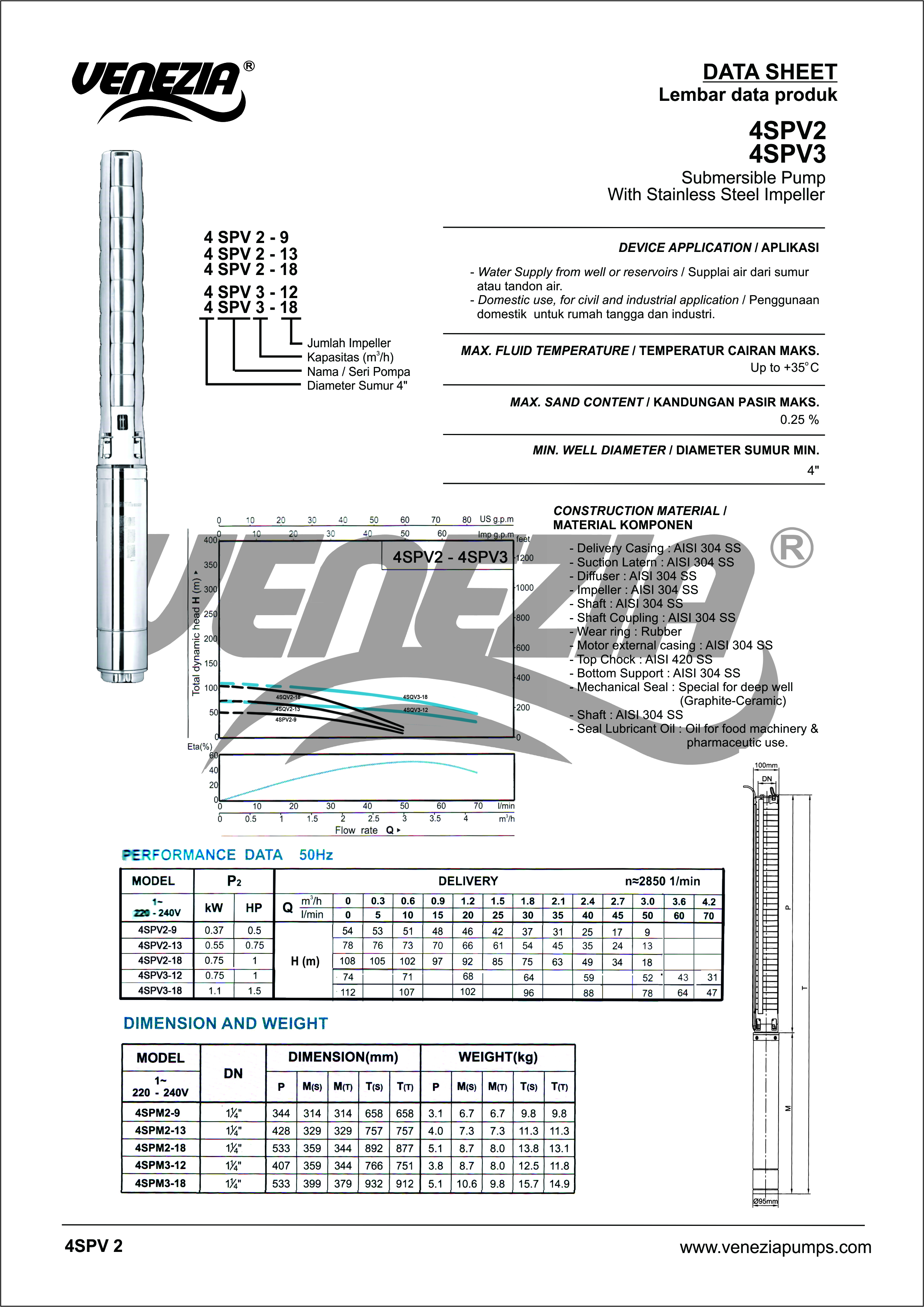 Pompa Submermersible 4SQV & 4SPV merupakan pompa sumur dalam dengan casing 4″.
