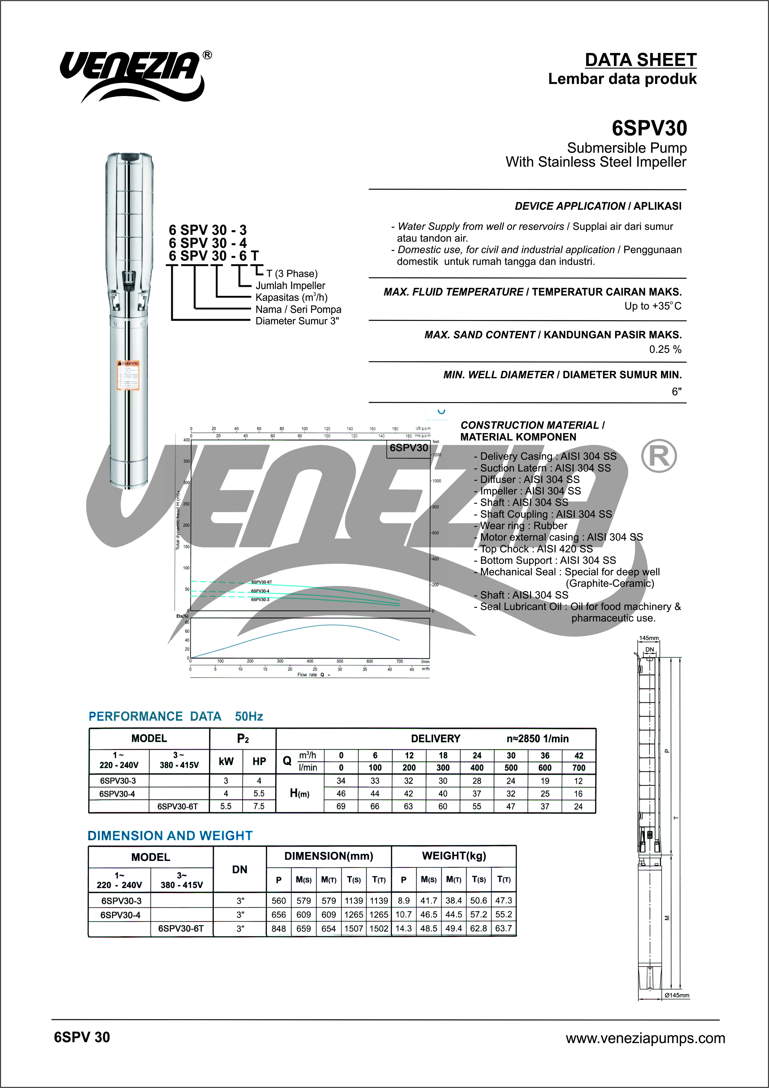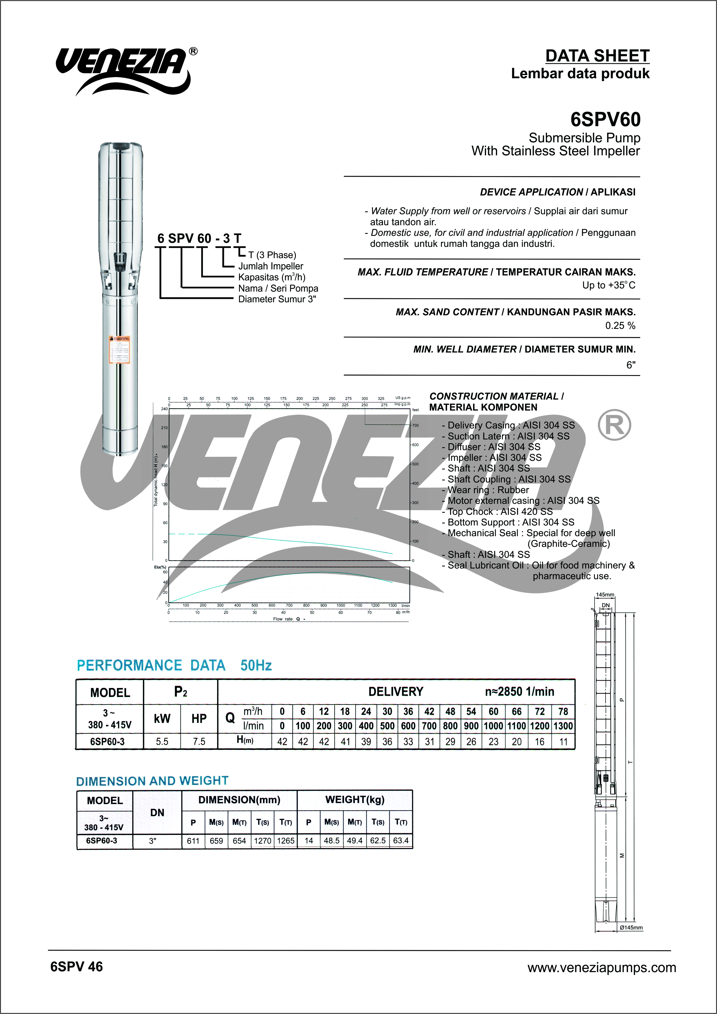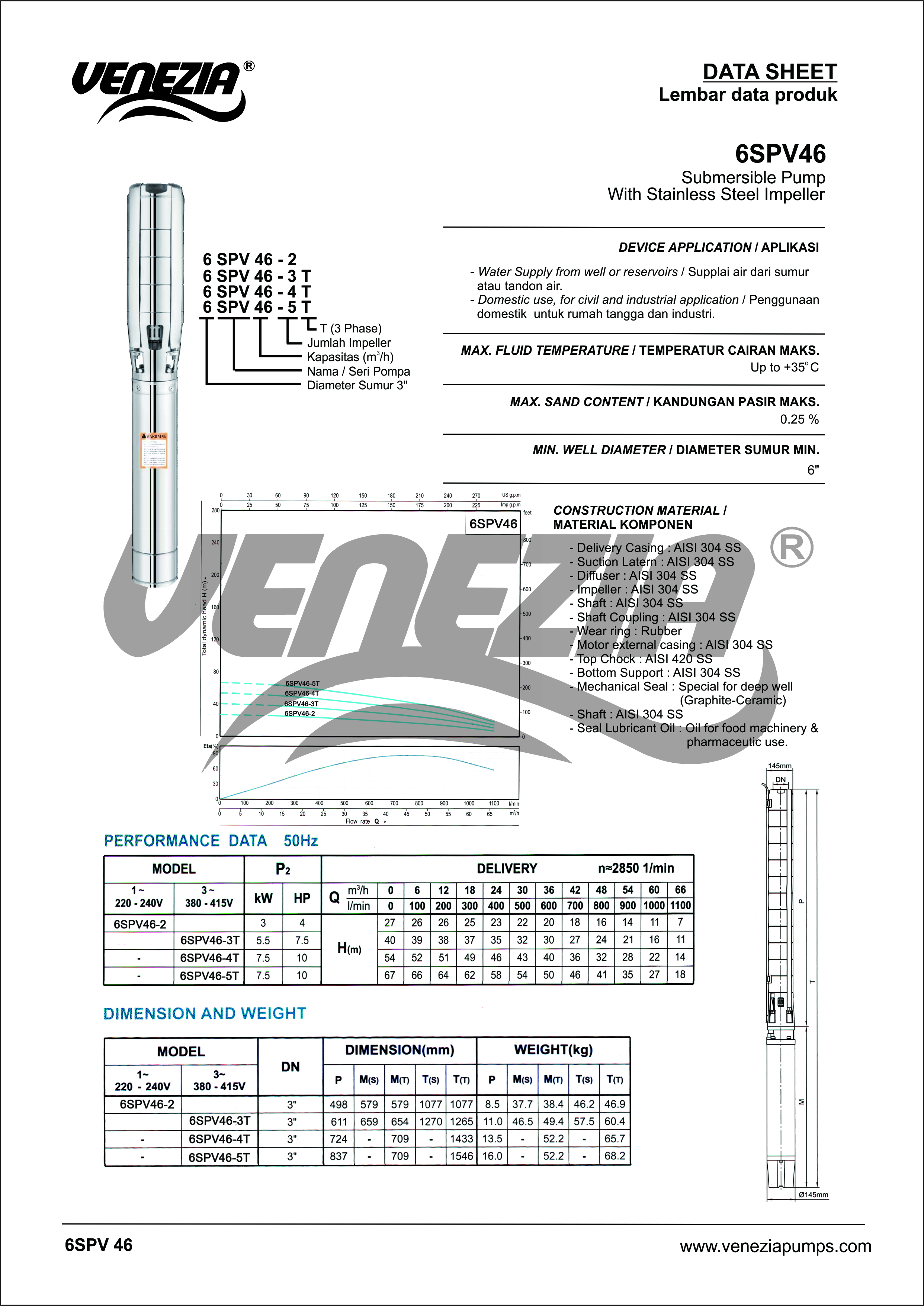 Pompa Submermersible 6SPV adalah pompa submersible dengan kapasitas besar dengan menggunakan motor 4″.
