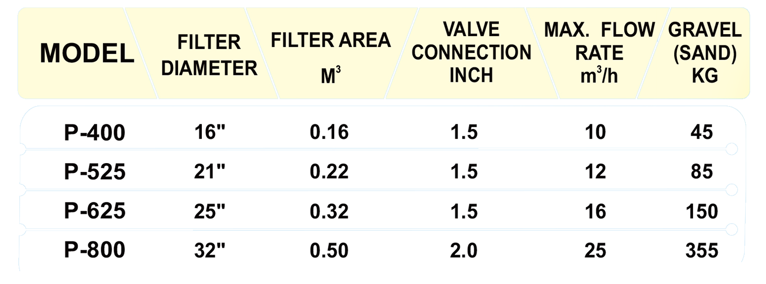 Fiter Kolam Renang P-400, P-525, P-625 dan P-800 merupakan Filter khusus kolam renang dengan Valve pengaturan diatas dan menggunakan media Pasir Silica (dengan diameter tertentu).